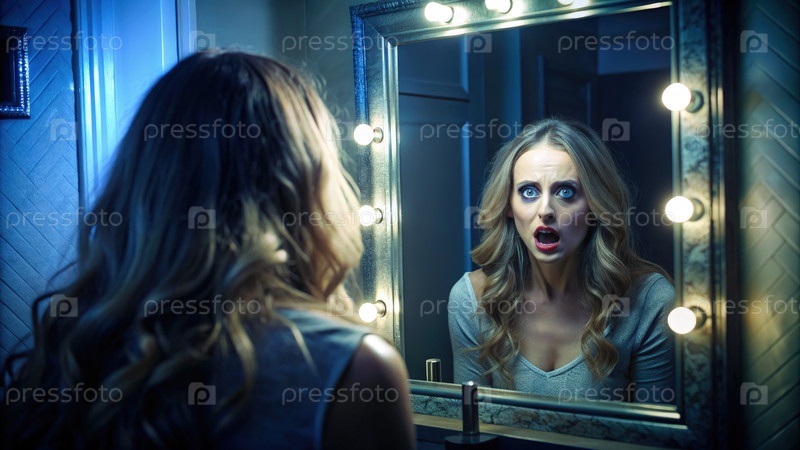 Испуганная женщина смотрит в зеркало тщеславия с яркими огнями