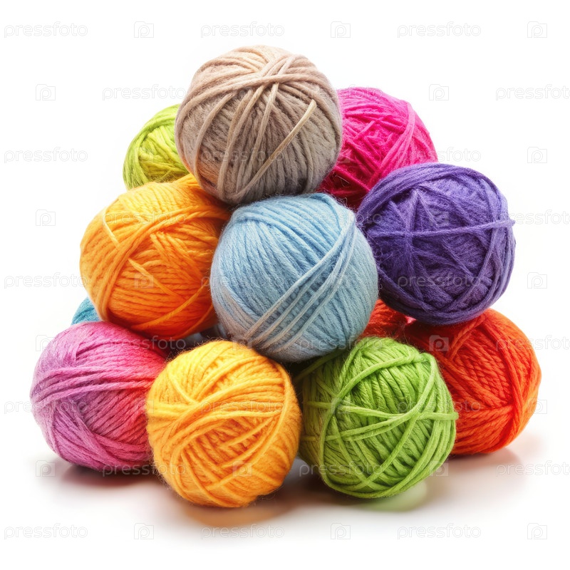 Красочные шарики из пряжи, расположенные в пирамиде на белом фоне