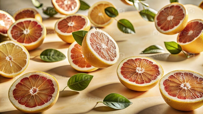 Свежерезанные грейпфрутовые половинки с зелеными листьями на легкой поверхности