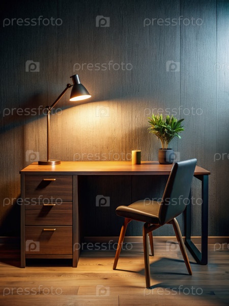 Пустой стол с лампой и стулом в слабо освещенной комнате