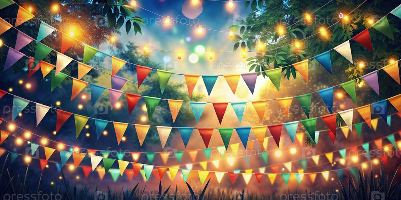 Цветные флаги июньской вечеринки висят вечером