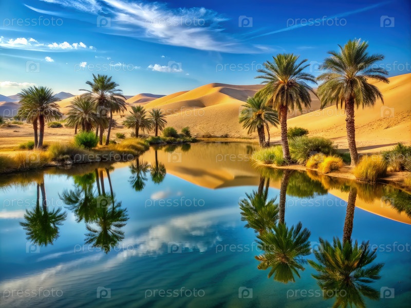 Спокойный оазис пустыни с пальмами и отражающей воду
