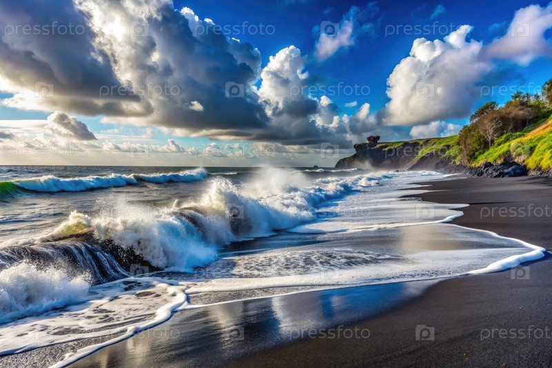 Потрясающие волны разбиваются на пляже с черным песком на Гавайях