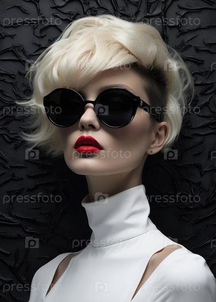 Блондинка с короткими волосами, носящая черные солнцезащитные очки и красную помаду на черном фоне