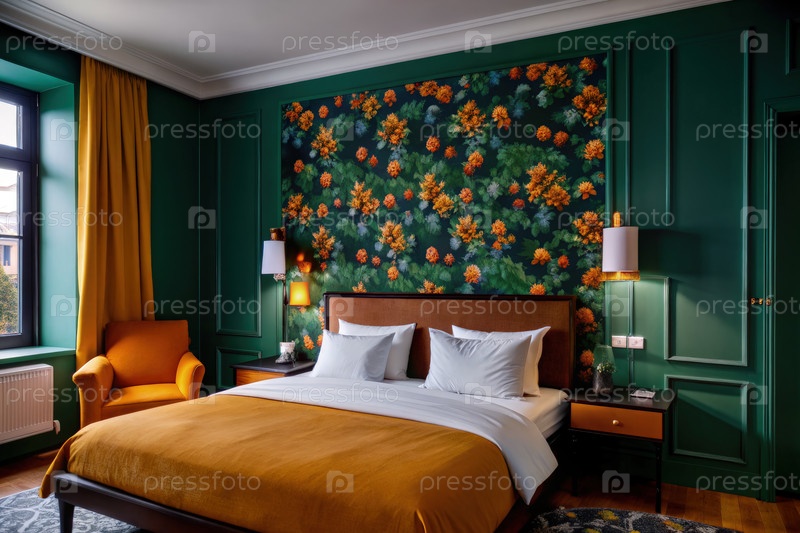 Зеленый и оранжевый гостиничный номер с цветочным обоями и удобной кроватью