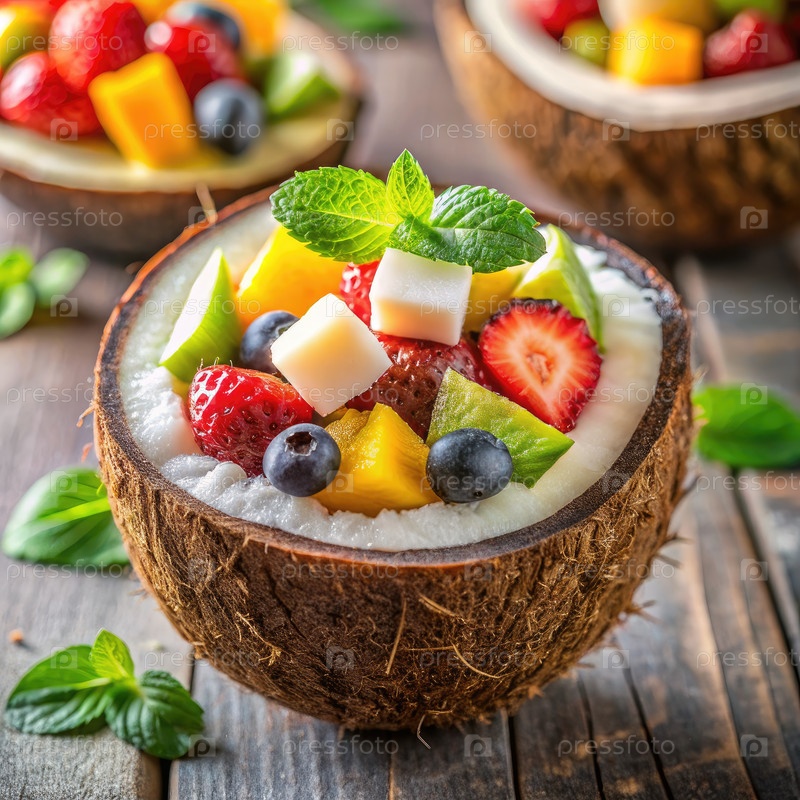 Кокосовая миска, наполненная свежим фруктовым салатом на деревянном столе