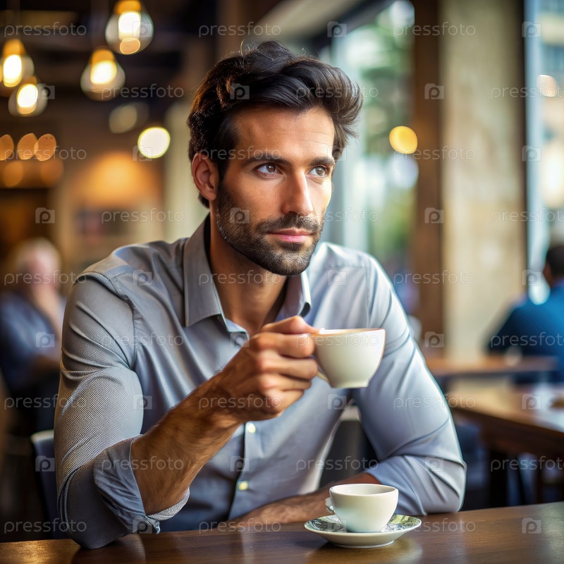 Вдумчивый мужчина, пьющий кофе в кафе