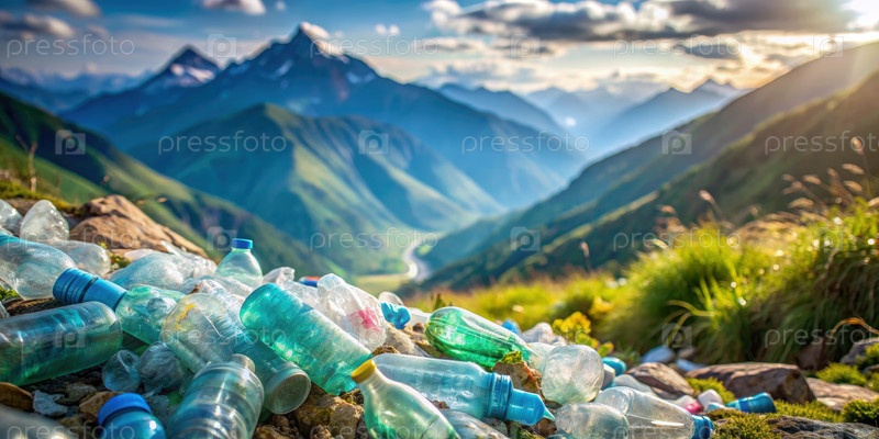 Пластиковые бутылки рассыпают пейзаж горной долины