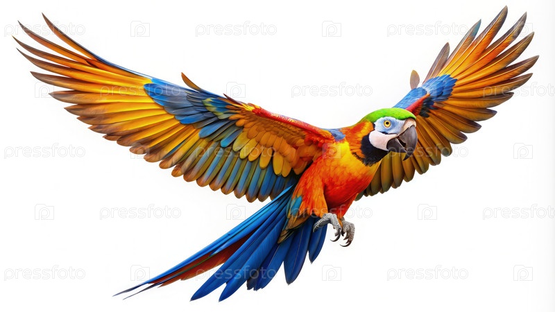 Красочный попугай Catalina Macaw в полете на белом фоне