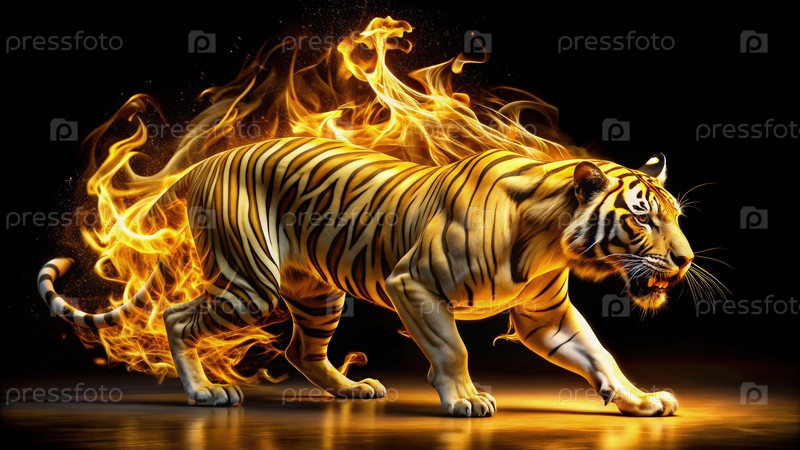 Золотой тигр, окруженный огненными пламенами на черном фоне
