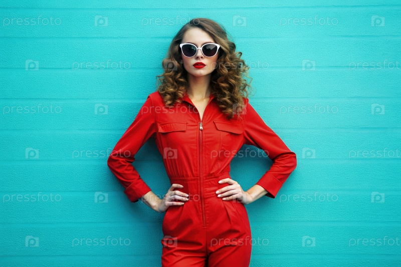 Женщина в красном комбинезоне позирует на бирюзовой стене