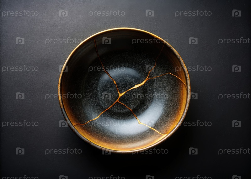 Кинцуги Bowl с золотыми трещинами на черном фоне