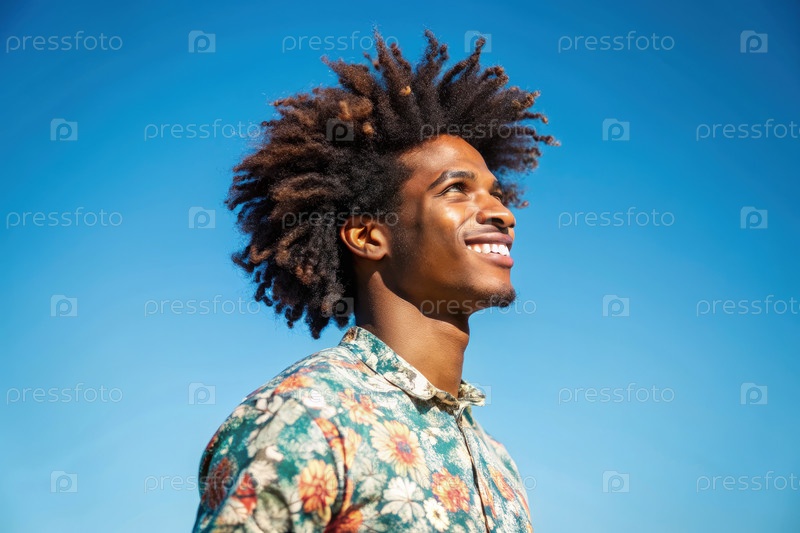 Улыбающийся афроамериканец смотрит в небо в солнечный день