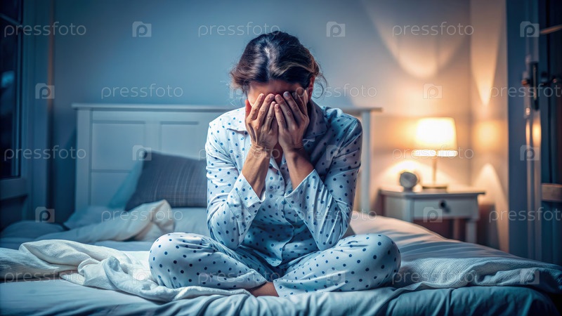 Женщина в пижаме, сидящая ночью на кровати с лицом в руках