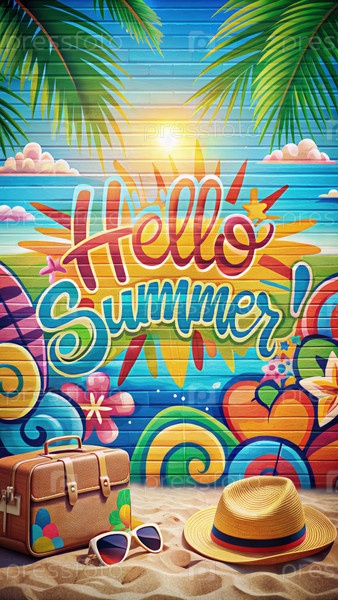 Красочные пляжные граффити приветствуют лето чемоданом, шляпой и солнцезащитными очками