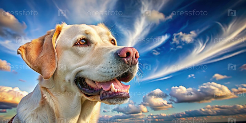 Счастливый лабрадор-ретривер смотрит на небо в солнечный день