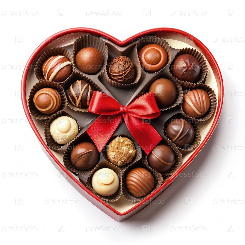 Коробка в форме сердца с разнообразными шоколадами с красной лентой