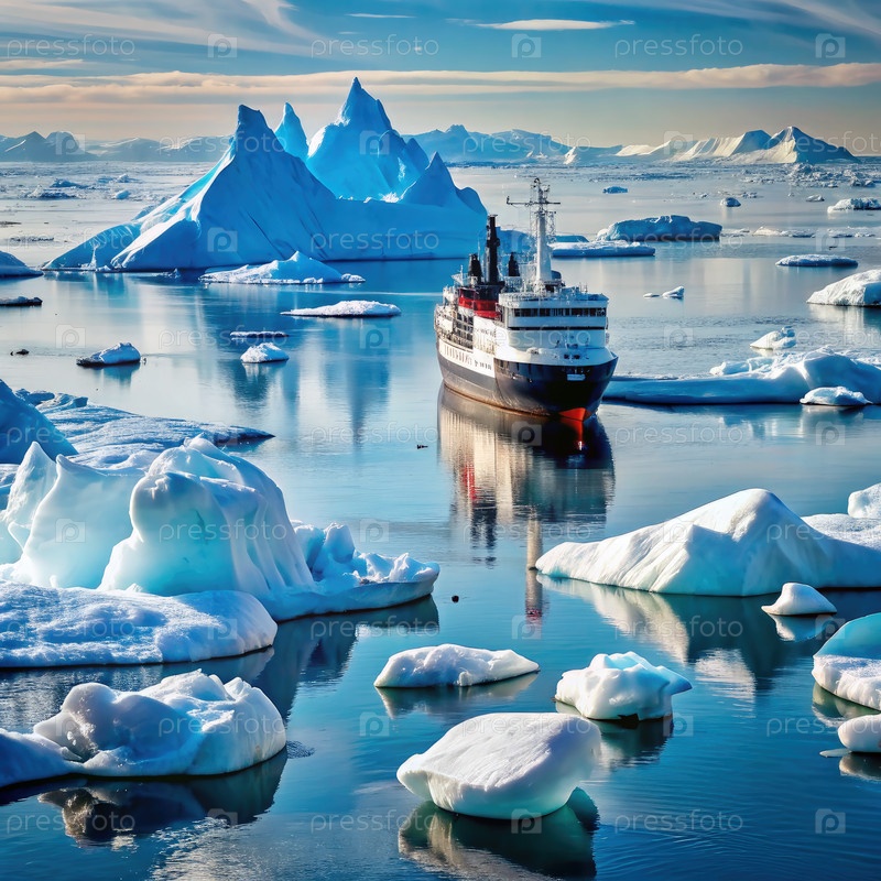 Круизный корабль пересекает поле айсбергов в Арктике