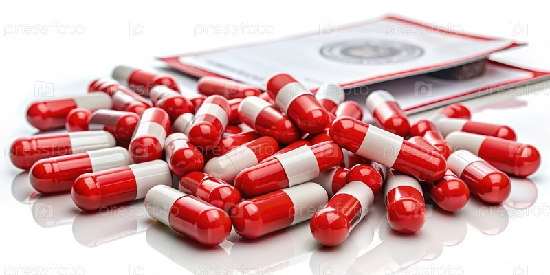 Красные таблетки разбросаны по белой поверхности с сертификатом на заднем плане