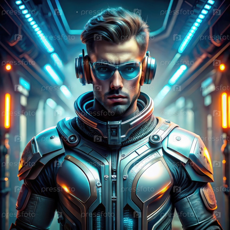 Футуристический человек в защитном снаряжении стоит в коридоре космической станции