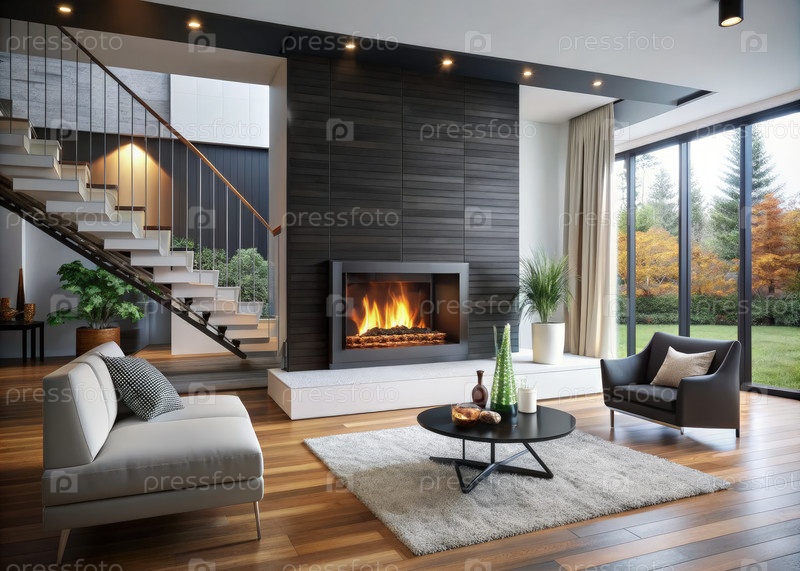 Камин в просторной гостиной с большими окнами и лестницей