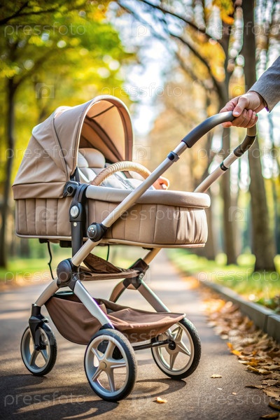 Мужчина толкает бежевую коляску на дорожку осеннего дня