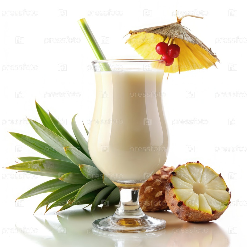 Кремный напиток Pina Colada с ананасом и зонтиком на белом фоне