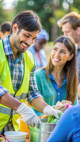 Улыбающийся волонтер подает еду на общественном мероприятии в открытом воздухе