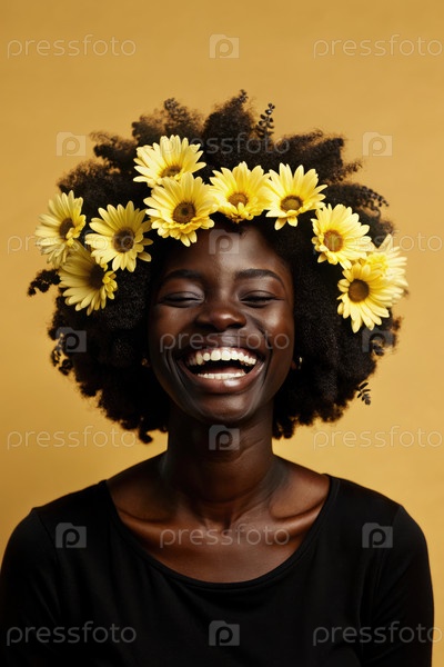 Улыбающаяся женщина с цветочной короной на желтом фоне