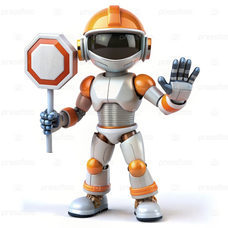 Мультипликационный робот, держащий знак остановки на белом фоне