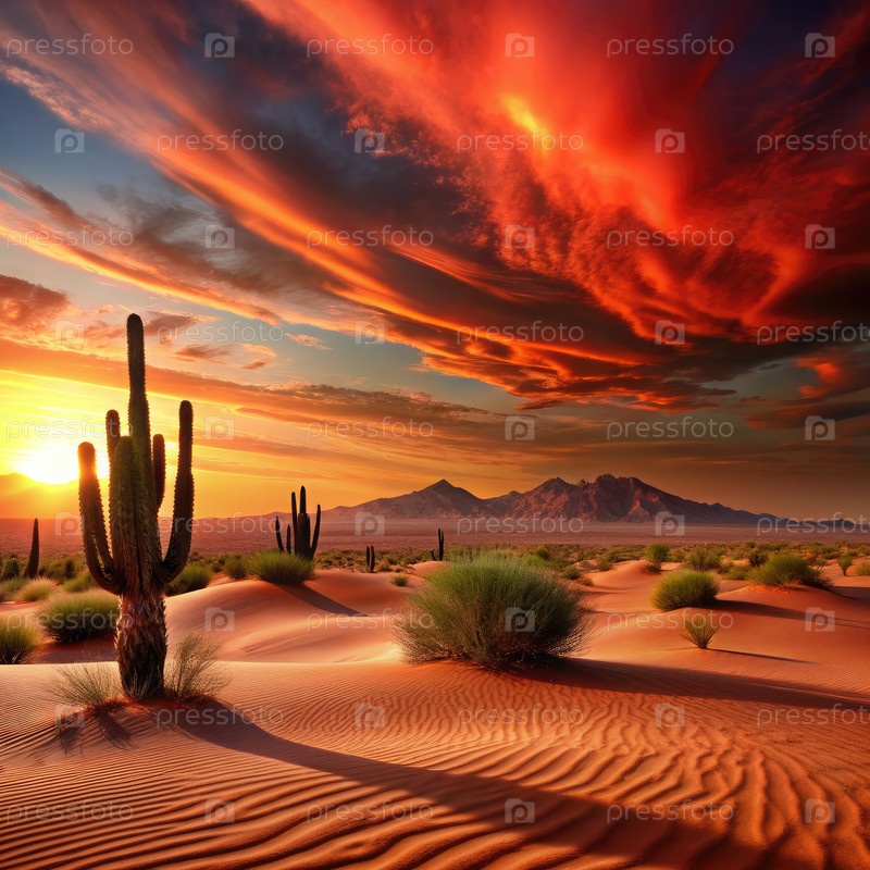 Потрясающий пустынный закат с кактусом сагуаро и горами