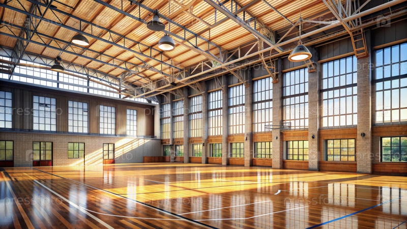 Пустой тренажерный зал с большими окнами и деревянным полом