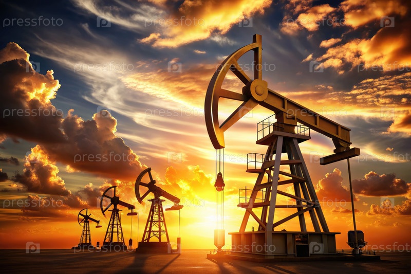 Нефтяные буровые платформы, оформившие силуэт против яркого заката