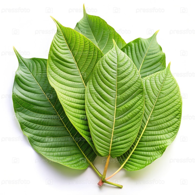 Свежие зеленые листья кратома на белом фоне