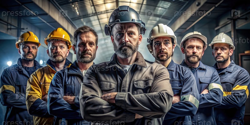 Промышленные рабочие, позирующие с перекрещенными руками на фабрике. генеративный ИИ