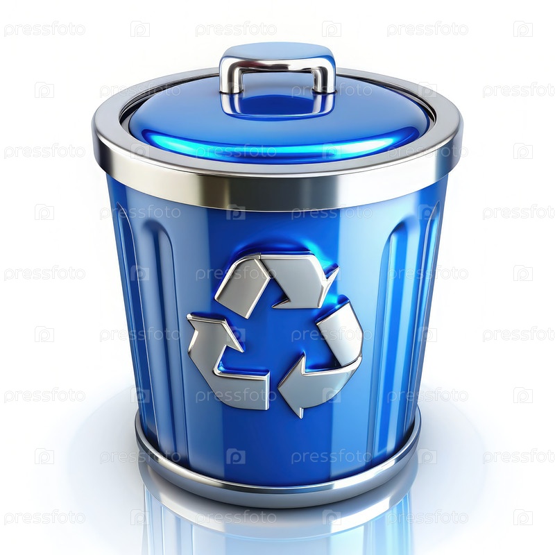 Синяя икона мусорного бака с серебряным символом переработки. генеративный AI
