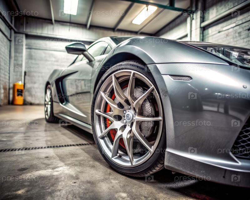Близкий взгляд на гладкий серый спортивный автомобиль в гараже