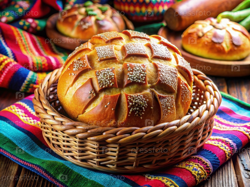 Свежевыпеченный мексиканский хлеб в корзине из смолы на красочной скатерти