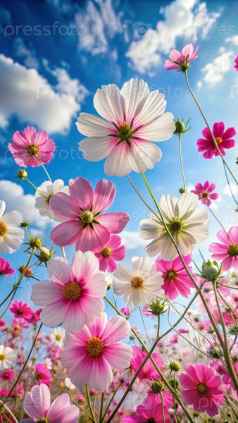 Розовые и белые цветы космоса расцветают против голубого неба