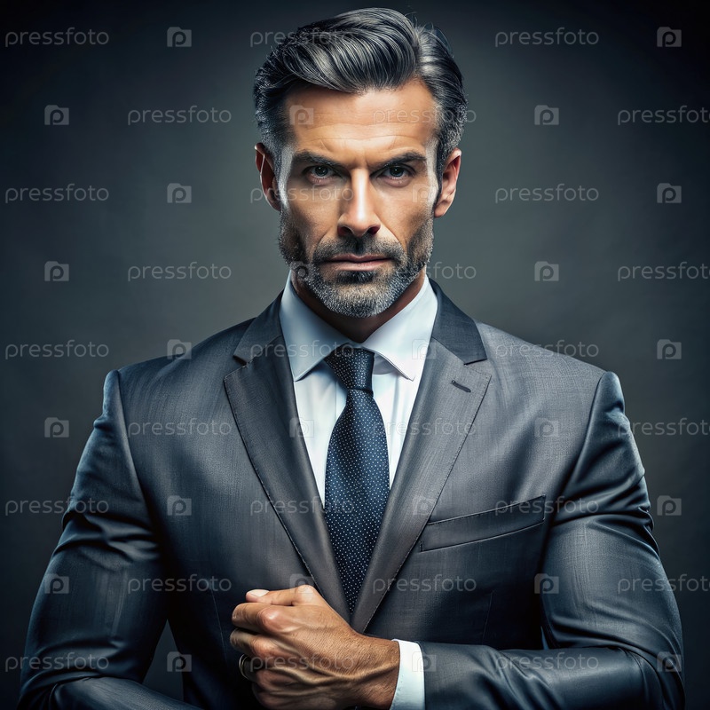 Сильный мужчина в костюме на заказ уверенно позирует на сером фоне