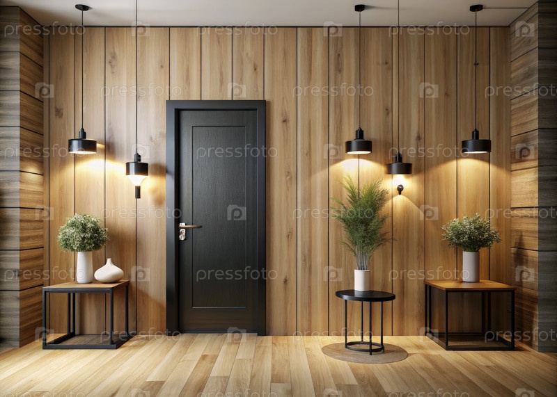 Дизайн интерьера с деревянными панелями, черной дверью и подвесным освещением