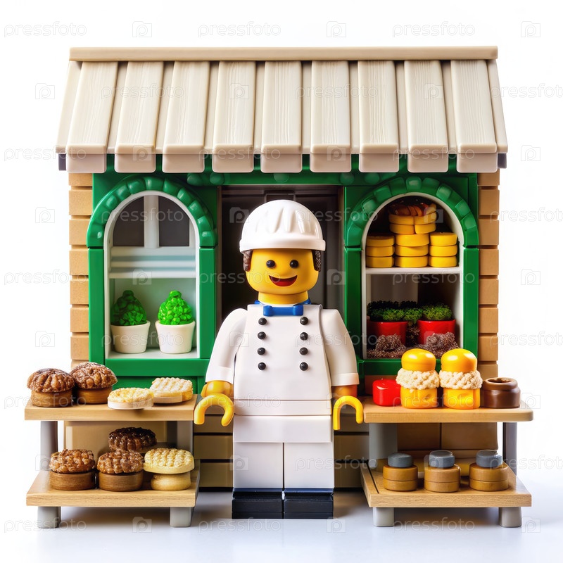 Lego Minifigure Baker продает хлеб в кирпичной пекарне