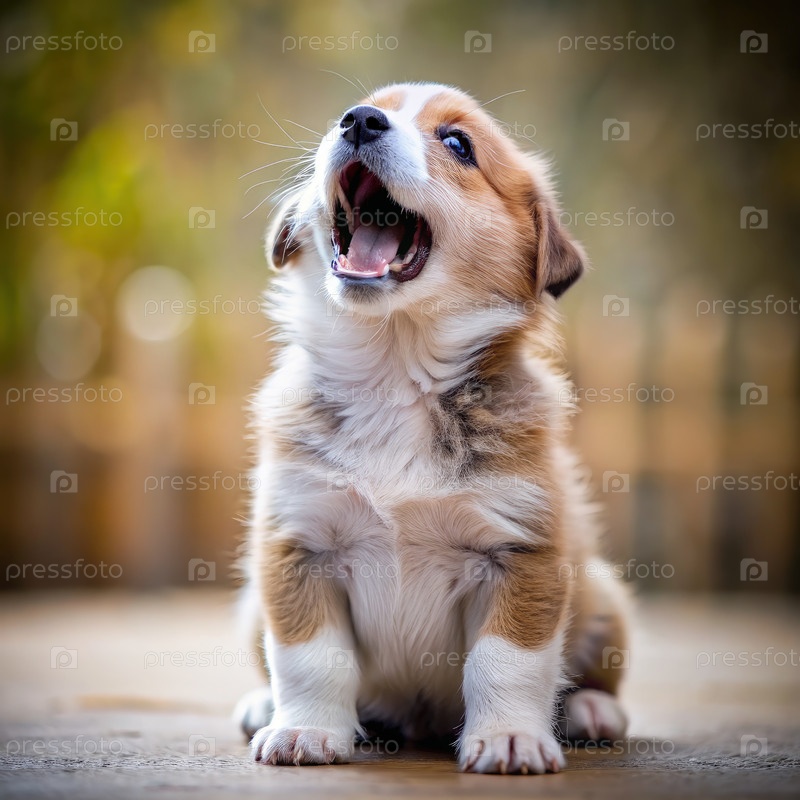 Очаровательный коричневый и белый щенк сидит и лает снаружи