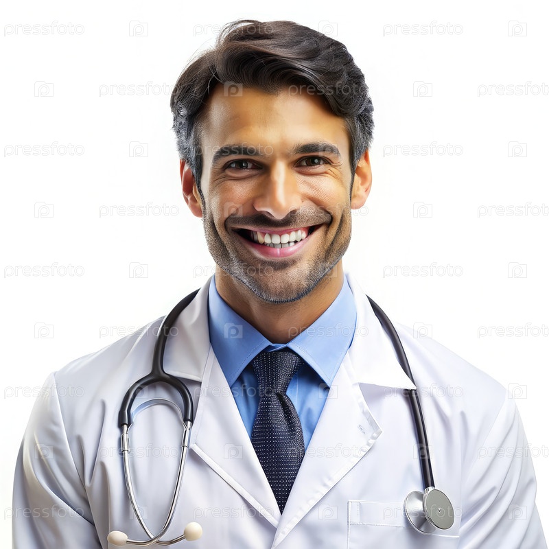Улыбающийся врач-мужчина в белом лабораторном пальто со стетоскопом на белом фоне