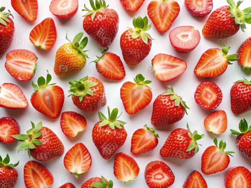 Свежие красные клубники, нарезанные наполовину, расположены на белом фоне