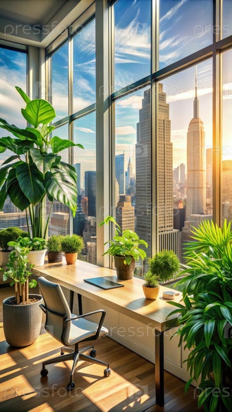 Солнечный офисный стол в Манхэттене с видом на горизонт города