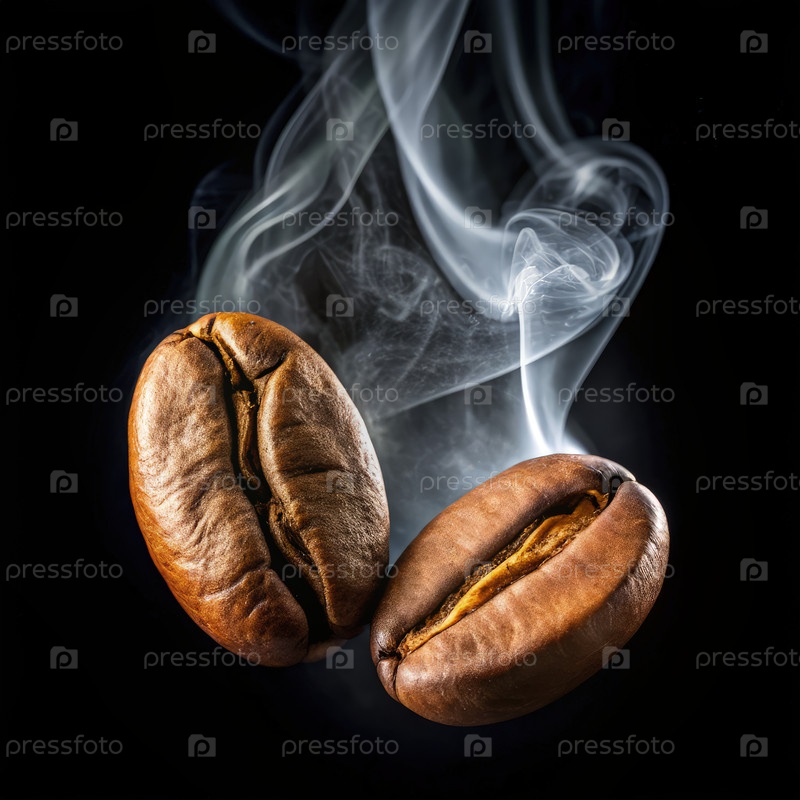 Две жареные кофейные бобы с дымом на темном фоне