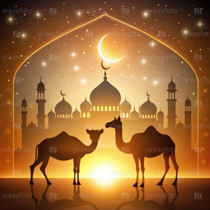 Поздравительная открытка на праздник Ид аль-Адха с верблюжьими силуэтами против мечети