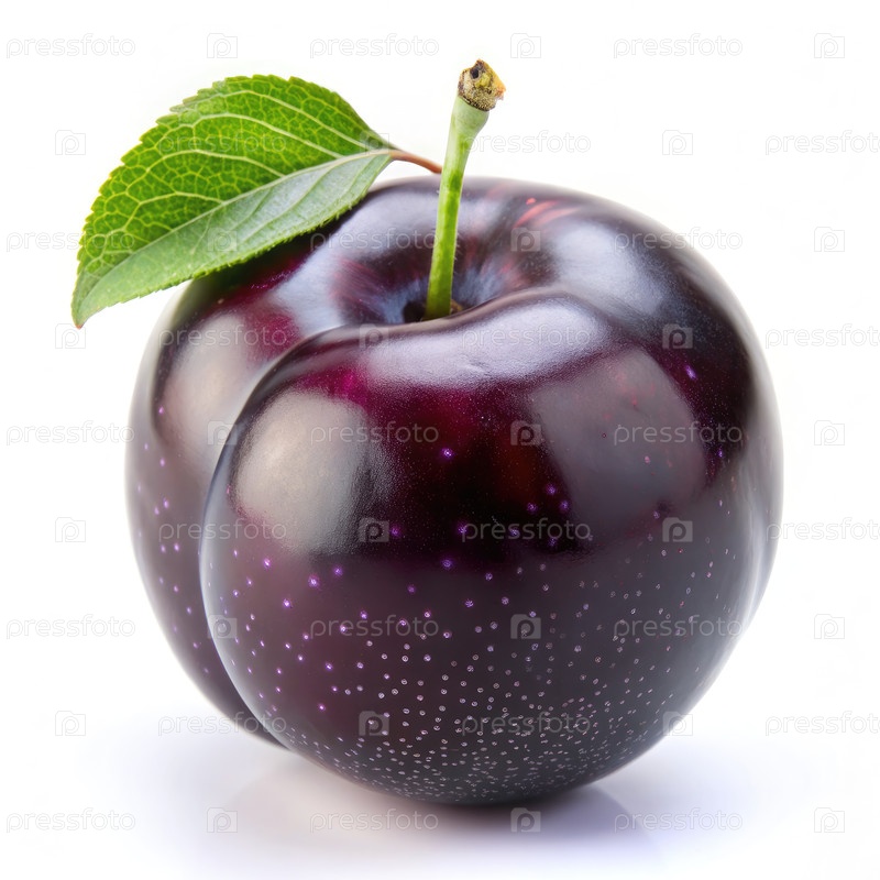 Одинокая свежая черная слива с зеленым листом на белом фоне