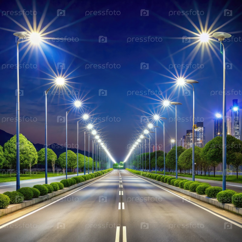 Просветленная дорога ночью с уличными фонарями и городским ландшафтом на расстоянии